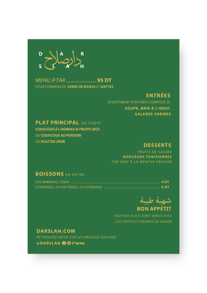 En plein cœur de la Médina de Tunis, à 150m de la Mosquée Zitouna, sur l’une des artères les plus riches et colorées des souks, la rue de la Kasbah, le restaurant « Dar Slah » vous accueille dans un cadre chaleureux et convivial pour vous faire voyager aux saveurs des goûts authentiques de la cuisine tunisienne.