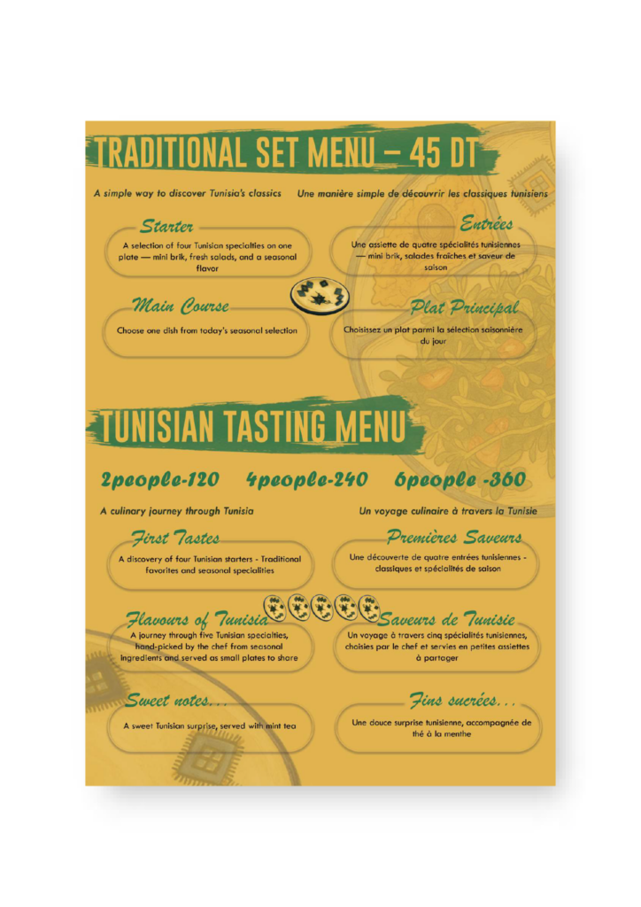 Entre mets traditionnels et créations originales pensées par son Chef et propriétaire, Sadri Smoali, vous pourrez goûter aux réjouissances gustatives des tables tunisiennes.