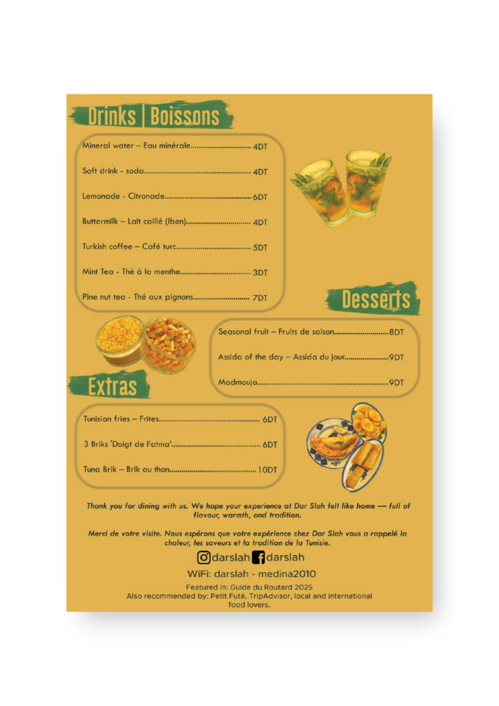 En 1988, Sadri, le fils ainé, reprend le flambeau du « Chez Slah » et perpétue l’héritage paternel pendant 22 ans, jusqu’à lancer son propre restaurant, son désir de toujours, le « Dar Slah » à la Médina de Tunis, pour pouvoir y partager sa passion de la cuisine familiale, typique et authentique tunisienne.